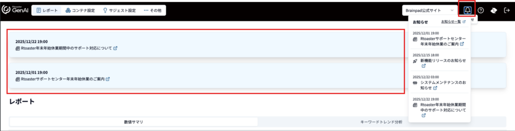 「GenAIに関するリリース情報等のシステムお知らせを通知する機能を追加しました。