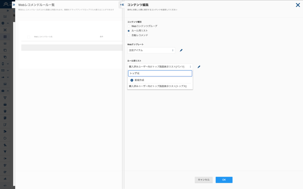 Webコンテンツグループ・ルール用リストで選択するコンテンツを検索によって選択できるようにします