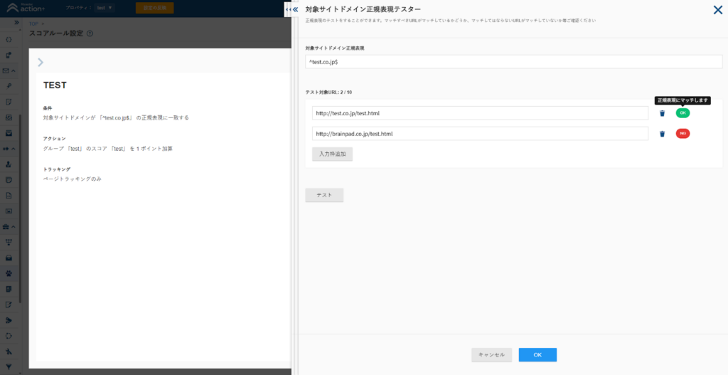 「正規表現のテスト機能を拡充してほしい」というご要望にお応えして、新たに「コンバージョンページ編集」やレコメンドルールにおける「条件選択」などの正規表現入力画面にテスト機能を追加します。 正規表現の記述ミスを管理画面上で確認できるようになり、 設定後のやり直しや手戻りを防ぎやすくなります。