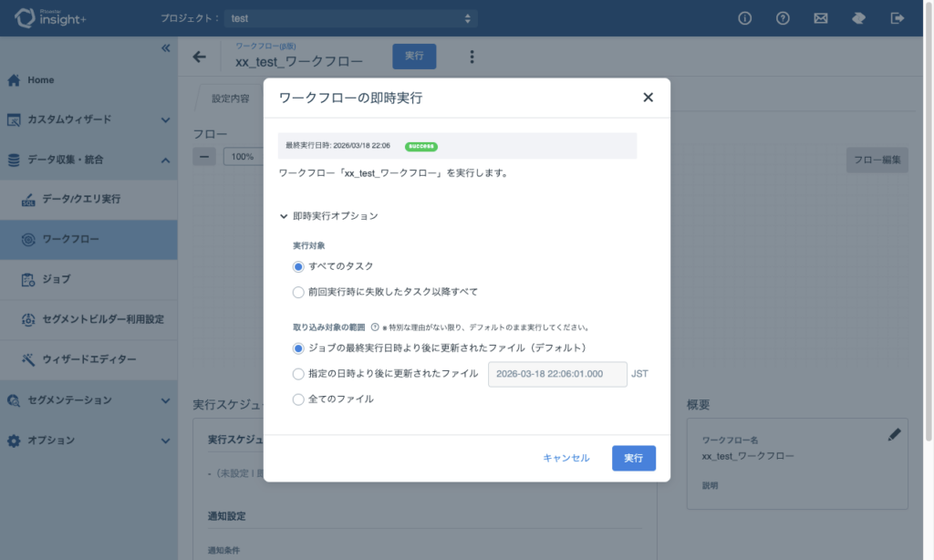 ジョブおよびワークフローの即時実行画面において、直近の実行日時とステータスが表示されるようになります。実行直前に最新の状態を確認できるようになるため、二重実行などの操作ミスの防止に役立ちます。